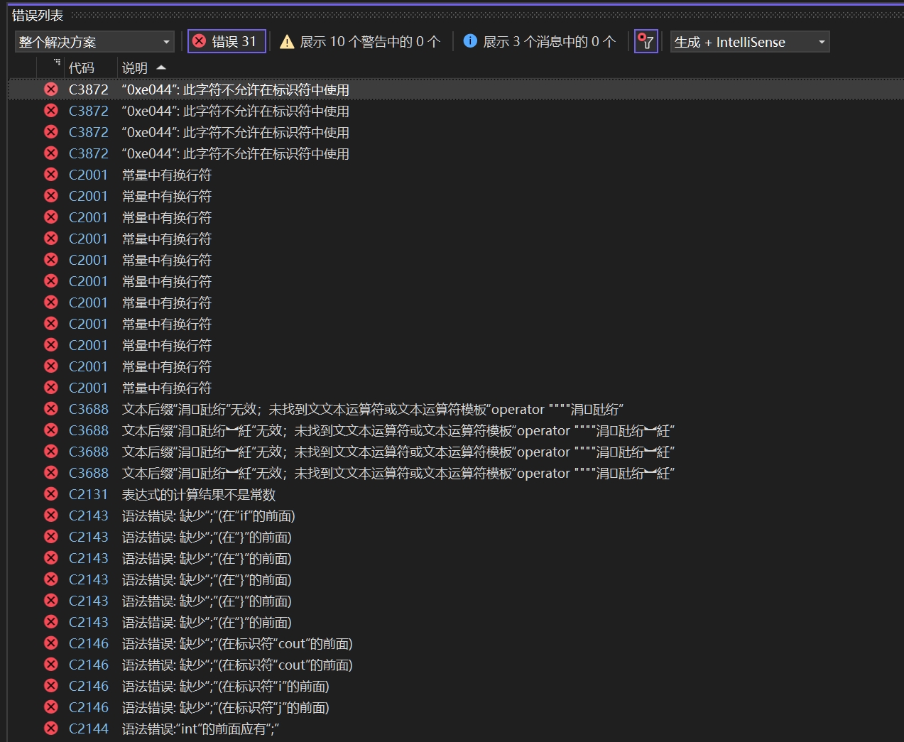 在使用VS运行程序的时候会报这样的错,”常量中有换行符”,运行之后是这样的乱码的。