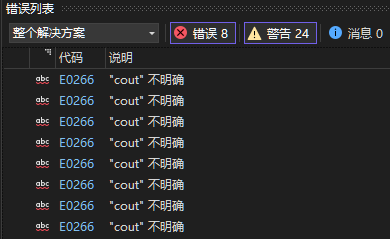 将using namespace std; 删除后Ctrl+S保存cpp文件,再加上using namespace std; 保存cpp文件就解决了。