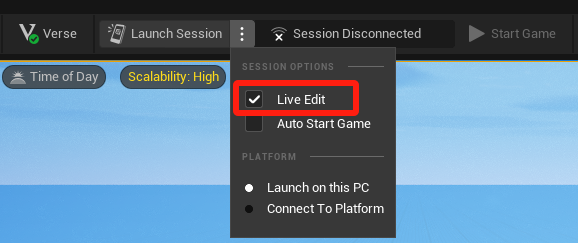 点击 Launch Session 就可以建立 Fortnite 和 UEFN 的连接,其中 Live Edit 如果没勾上,即在 Fortnite 的创造模式下做的任何更改不会同步到 UEFN。Auto Start Game的意思是默认进去就是游戏模式,不勾的话进去就是创造模式。