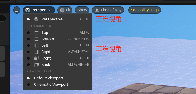 默认都是 Perspective 视角下进行开发,不过为了更好地调整一些资产的位置,可以使用2D视图来编辑。