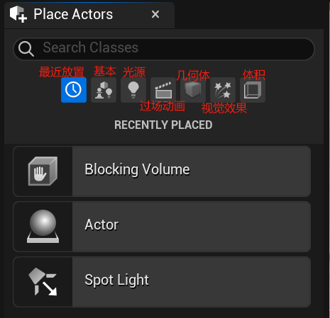 Actor 大概就是静态资产、音效、摄像机、角色玩家之类可以放置到我们的游戏世界的任意对象,可以把 Place Actor 理解成把这些东西放置到世界的一个工具栏(?)