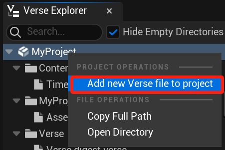对 Verse Explorer 里的项目文件夹右键单击可以新建一个 Verse文件,这个文件就是用于编写代码的文件。