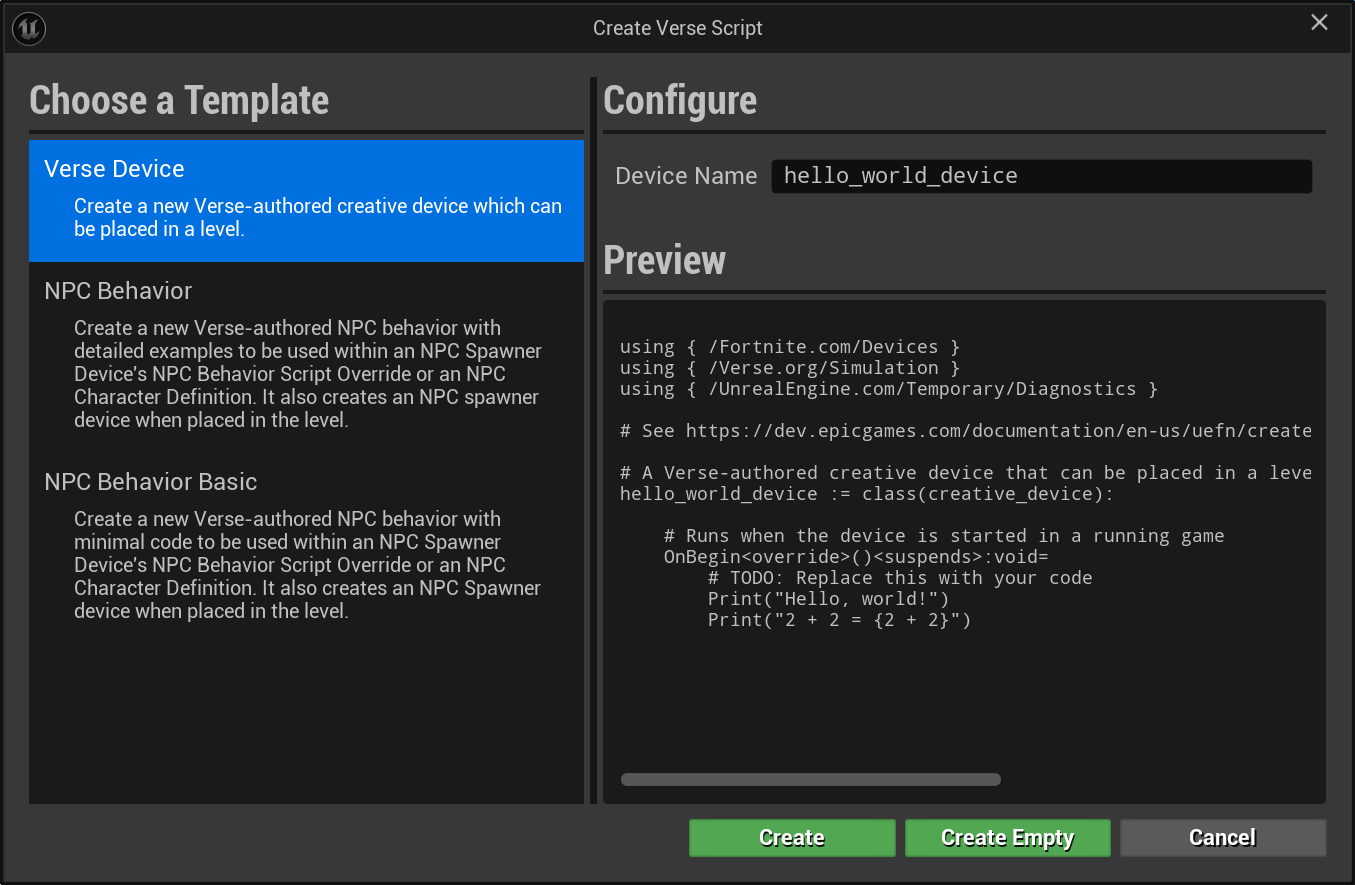 新建 Verse文件,左边是选择 Verse文件的模板,右边主要改脚本名字,就可以创建脚本文件了,可以选择创建模板脚本还是空脚本。