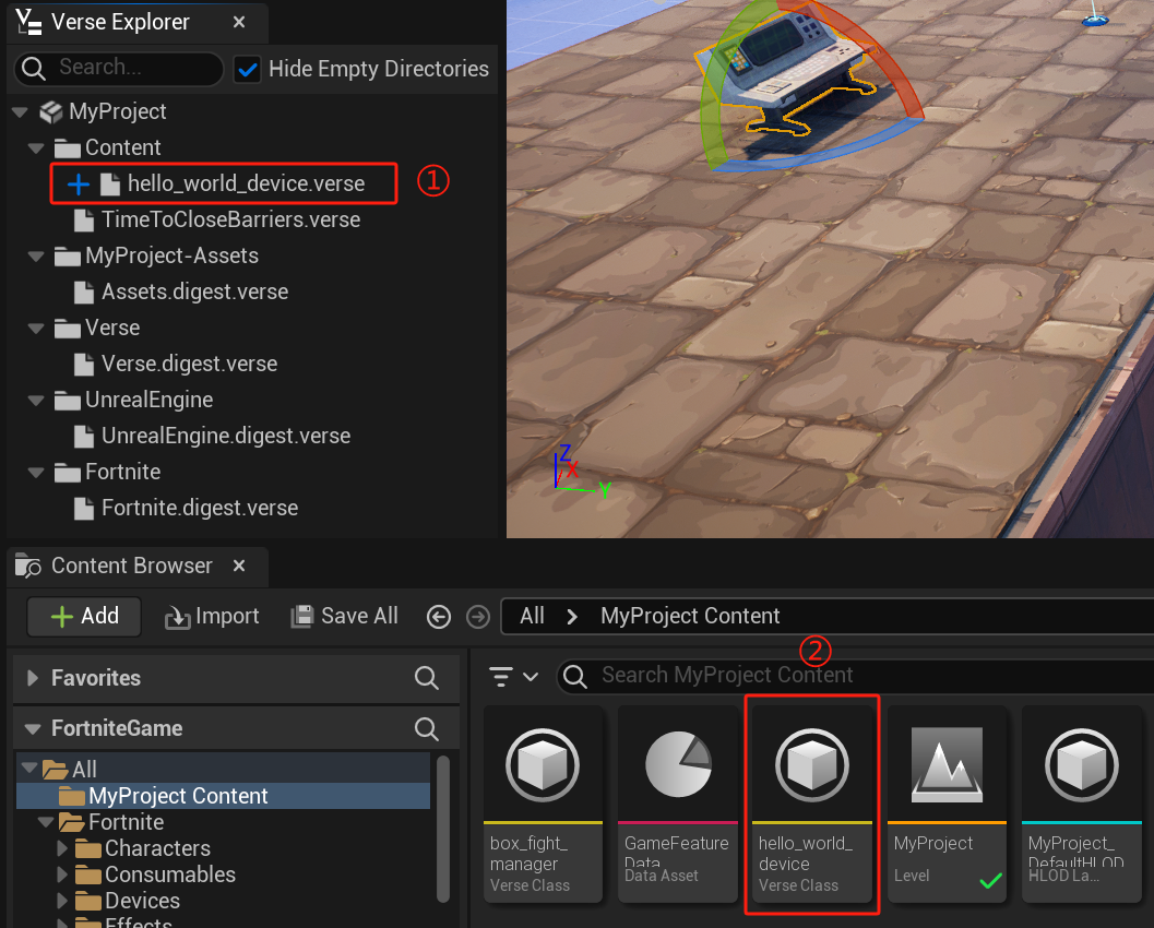 创建完的文件可以在两个路径下找到:①Verse Explorer 下的 Content 里,②Content Browser 下的 Content